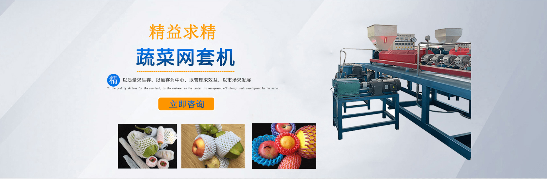 本公司創(chuàng)建于2002年,是一家集研發(fā)、加工、制作為一體,專門制作水果、蔬菜、玻璃器皿等發(fā)泡軟包裝設(shè)備的生產(chǎn)廠家。公司擁有眾多專業(yè)骨干人員,技術(shù)力量雄厚,可提供全套的售前及售后一條龍全方位服務。公司主營EPE發(fā)泡網(wǎng)套機、EPE發(fā)泡棒自動化設(shè)備。是深受業(yè)界好評的網(wǎng)套機生產(chǎn)廠家,我廠生產(chǎn)的網(wǎng)套機價格合理,歡迎新老客戶前臺詢價!